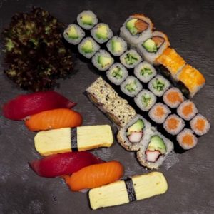6 Kappa Maki, 6 Sake Maki, 6 Avocado Maki, 6 Nigiri, 4 California Rolls, 4 Alaska Rolls